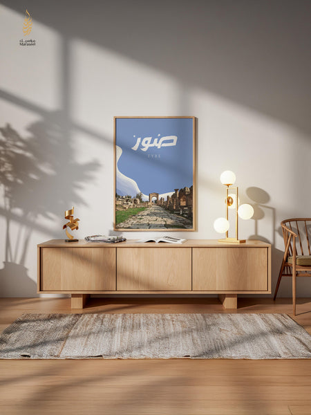 An Arabic calligraphy wall art print framed and displayed in a room setting, featuring the name of a city Tyre South Lebanon