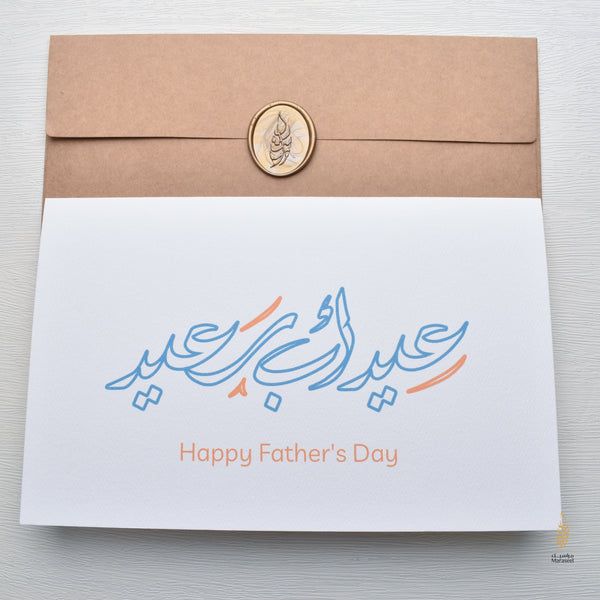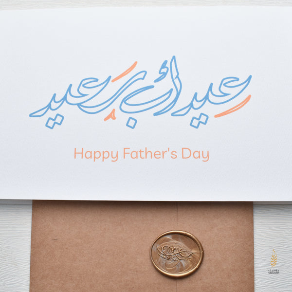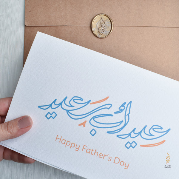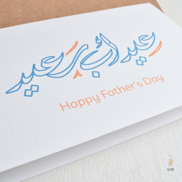 Featuring the classic Arabic phrase عيد أب سعيد (“Happy Father’s Day”) in hand-drawn calligraphy, this design blends a fresh mandarin orange with turquoise blue: a modern yet culturally rooted aesthetic.