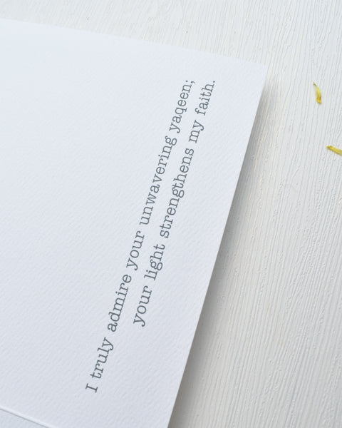 This elegant greeting card from Maraseel captures the essence of unwavering faith and the deep connection it can foster between loved ones. The focal point is the beautifully rendered Arabic calligraphy, which conveys a profoundly meaningful sentiment: "I truly admire your unwavering yaqeen (conviction); your light strengthens my faith."