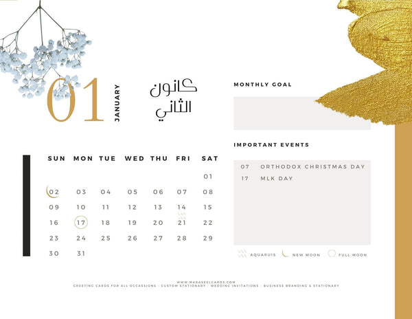 Don't miss your important dates again! This Arab Culture-inspired calendar contains all the events that you will never want to miss. From Ramadan, Eid, and even Full Moons and Horoscopes, this calendar has it all in one place. The minimal design shown in its alternating months presents 12 Traditional Sayings from the Arab World with an illustration and translation beside it. You can also add your own personal events by adding a note at the bottom of each month or printing it out at home and personalizing it yourself!
