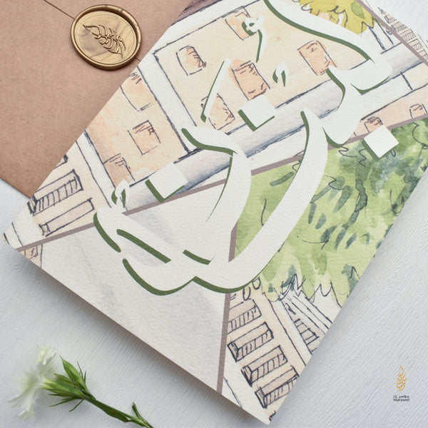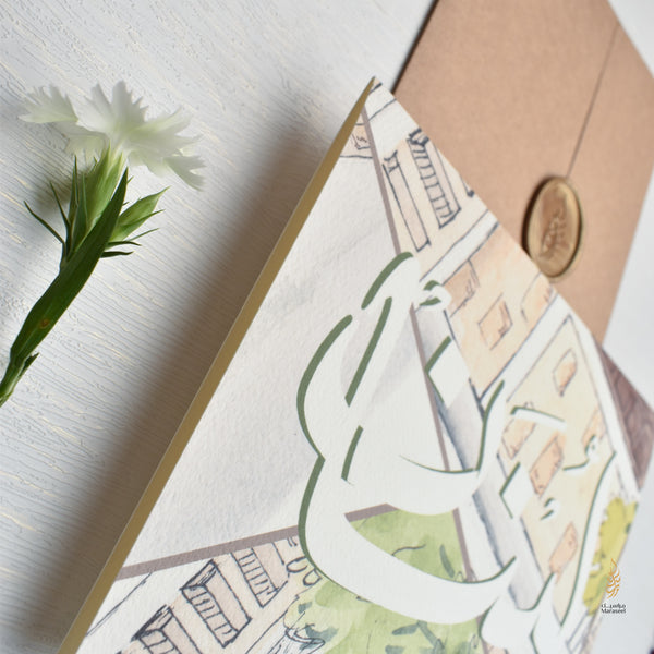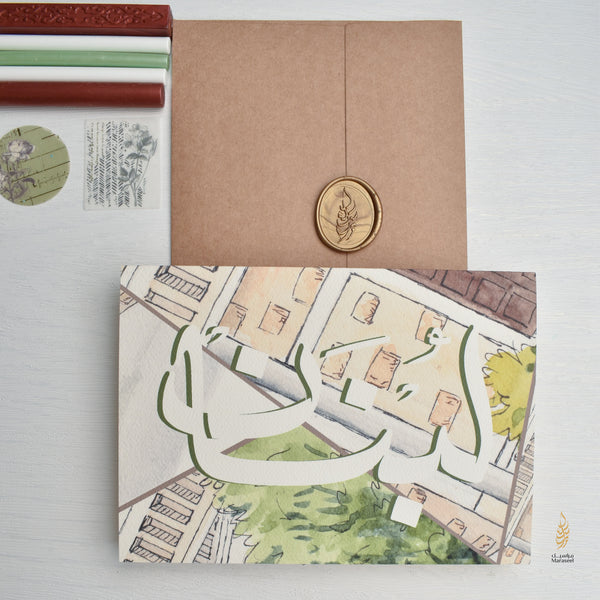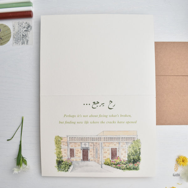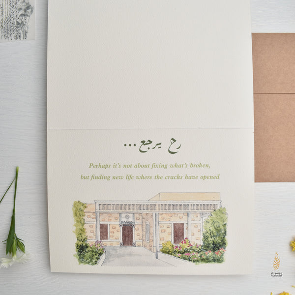 The concept that this card was made in tribute to grandma badr who lost both of her houses during the last lebanese war and the cover features this broken house and the interior of this house reconstructed as a message of hope.. more about the story on Instagram.