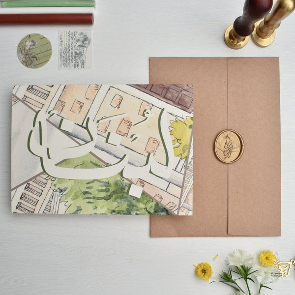 A one-of-a-kind design, a little bigger than your palm. Comes with a kraft envelope, wrapped beautifully, and includes the story behind the card. Can be shipped, locally delivered, or picked up for free.