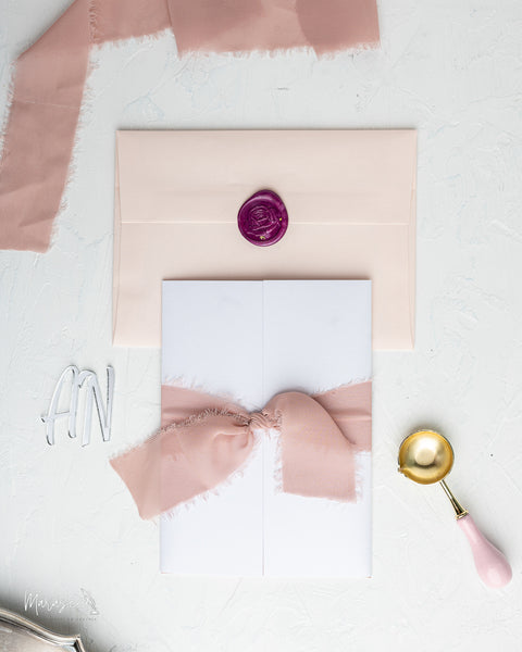 The Blush Dream Wedding Invitation Suite exudes a soft and romantic charm, perfect for couples who envision a wedding filled with elegance and intimacy. Featuring a delicate blush ribbon and a deep magenta wax seal, this suite is designed for those who appreciate understated beauty paired with luxurious details.