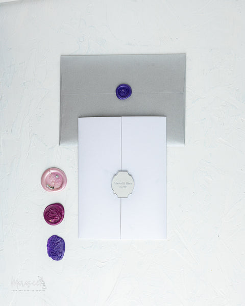 Custom Wax Seals: Choose from an array of colors including periwinkle, pink, purple, and silver to personalize your suite.