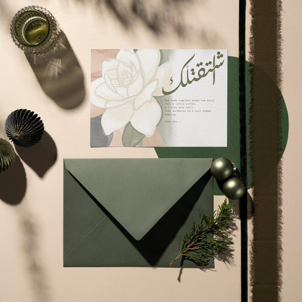 The Shta2telek or Shta2tellak card is wrapped in the warmth of a single gardenia: the flower of memory, softness, and elegance. Paired with Arabic calligraphy that whispers “I miss you” wavy in Farsi calligraphy just like the Gardenia’s petals… and soft English prose that reads: