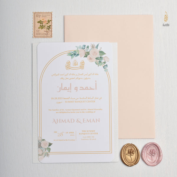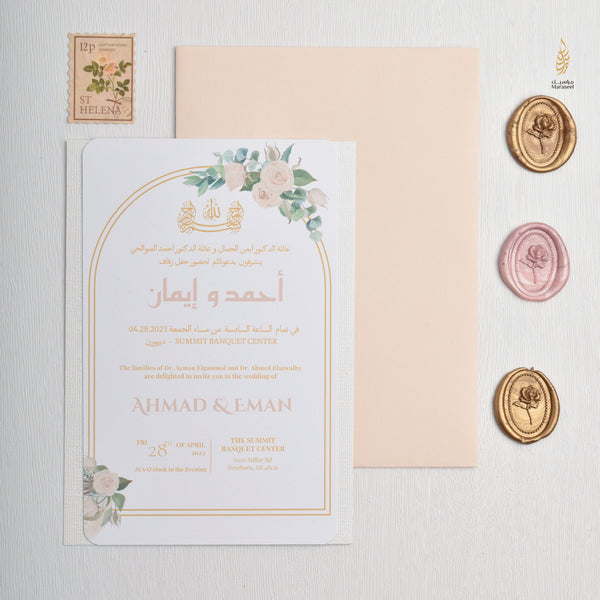 - Includes: Invitation card with a linen or metallic envelope, your choice of embellishment (wax seal OR ribbon), and an RSVP or Save the Date card.