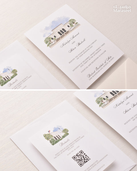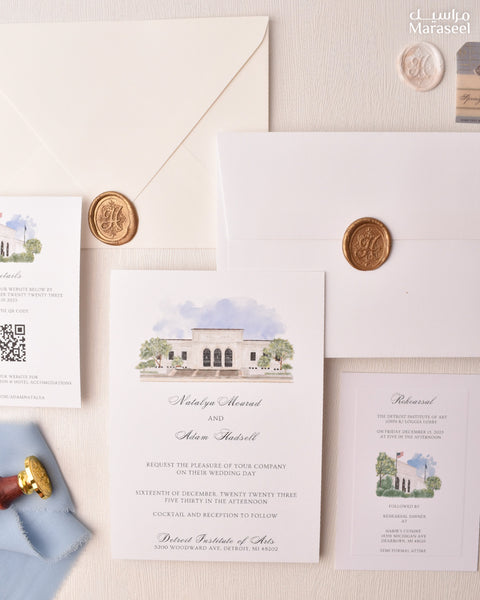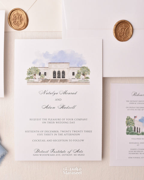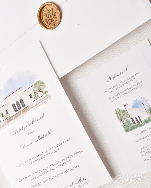 This elegant suite features a hand-painted watercolor illustration of your venue, transforming your invitation into a timeless keepsake. Whether it’s the Detroit Institute of Arts or a mosque that holds generations of memories, your venue becomes part of your love story.